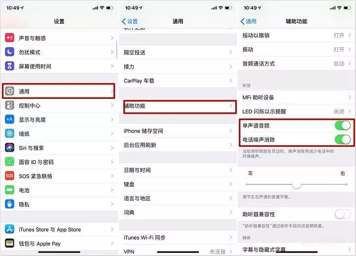 首先打開「設置」> 選擇「通用」> 點擊「輔助功能」> 找到「單聲道音頻」以及「電話噪聲消除」并都選擇開啟。