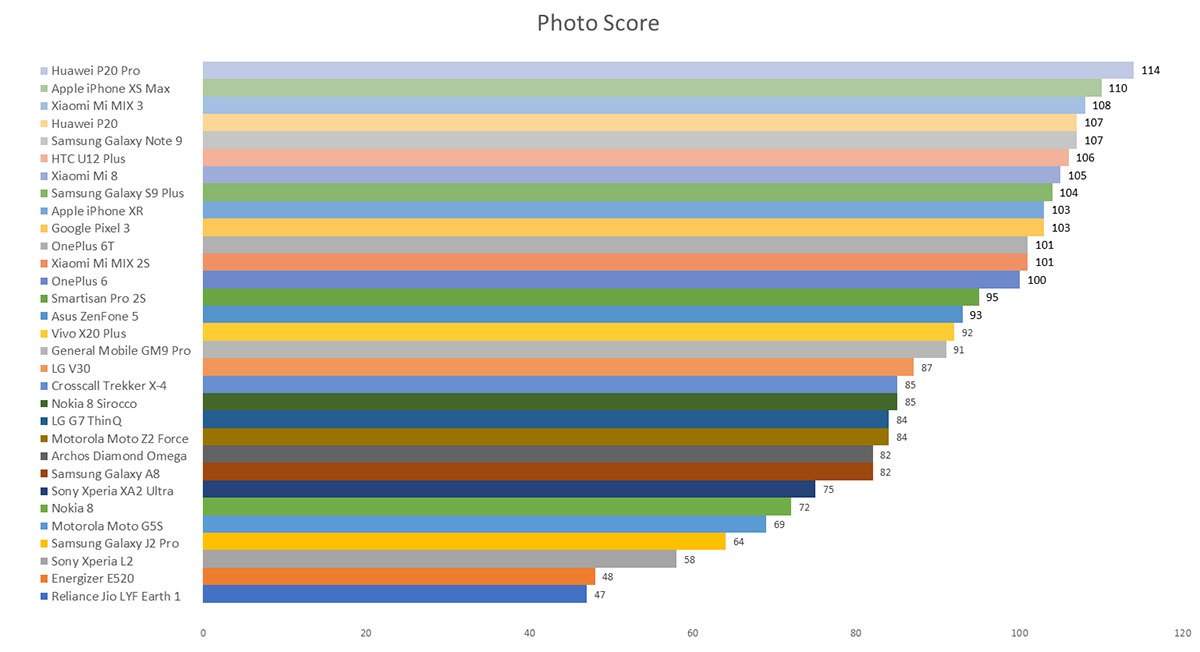 根據Dxomark發布的2018年手機拍照性能排行榜的整體得分榜單顯示:排在第一的依舊是去年3月份發布的華為P20 Pro以109分的成績霸占著首榜一年多的時間。而iPhone XS Max以105分緊跟其后,htc U12 Plus這是103分排在第三位,三星Note9則是第四位,小米MIX3緊跟其后在第五位。