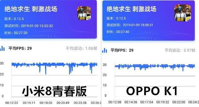 關(guān)于這兩款手機(jī)在運(yùn)行《刺激戰(zhàn)場(chǎng)》之時(shí)產(chǎn)生的差異化,同樣在實(shí)時(shí)幀率監(jiān)控軟件中得到佐證。在同樣時(shí)長(zhǎng)(27分鐘)的游戲中,小米8青春版的幀率波動(dòng)性比較高,曲線起伏較大;OPPO K1的游戲幀率平均保持在29fps(滿幀30fps),平均幀率波動(dòng)為0.97幀,幀率曲線雖有起伏,但并沒(méi)有存在斷崖式的情況,整體表現(xiàn)更勝一籌。