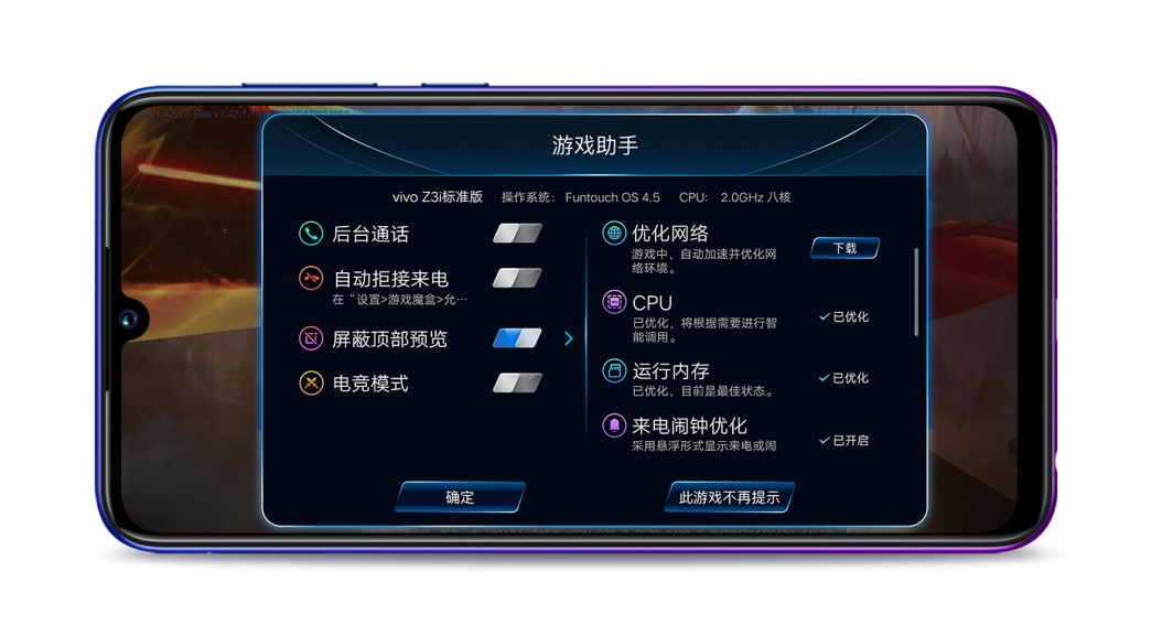 與此同時,vivo Z3i 標準版搭載全新游戲魔盒,充分滿足玩家需求。如增加后臺掛機和電競模式2.0,不僅能夠做到游戲刷經驗、聊微信不耽誤,而且系統(tǒng)能夠將手機游戲的設置調整為專業(yè)競技狀態(tài),智能調度資源,匹配更佳的游戲環(huán)境,讓玩家更專注于游戲中,進一步提升移動電競體驗。