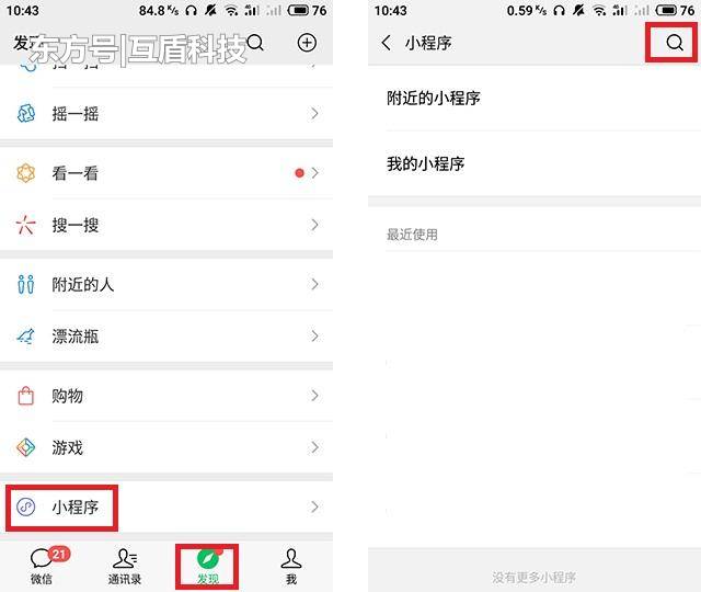 4、在微信上點擊【發(fā)現(xiàn)】,找到【小程序】,我們進(jìn)入到小程序中,在頁面的右上角有一個搜索按鈕,點擊它進(jìn)入搜索功能。