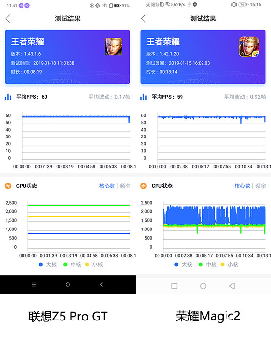 這里我們對比兩款手機的幀數運行曲線可以發現,聯想Z5 Pro GT的曲線十分穩定,全程全部穩穩的跑在60幀,沒有任何幀數波動,驍龍855的強悍性能表露無遺。聯想方面在游戲模式中的專門優化也不可或缺,我們可以看到CPU的運行頻率曲線完全是一條直線,它在持續不斷的為游戲保持足夠的性能。榮耀Magic2的幀數曲線同樣相對穩定,不過與聯想Z5 Pro GT相比,則有著明顯的波動,并在團戰時會略有波動,雖說即使在波動下也有著50幀,完全不會被感受到,但這種波動是不應該出現在旗艦機型中的。