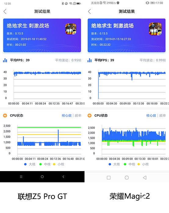 接下來我們看看兩部手機在《絕地求生:刺激戰場》中的性能表現,這里我們同樣將畫質全部開啟到最大,需要注意的是,刺激戰場對于手機的性能要求十分苛刻,其最大幀數鎖定在40幀。還是來看游戲運行的幀數曲線,聯想Z5 Pro GT運行依舊比較穩定,大部分的場景在39-40幀波動,極個別的場景下會略有下降,整體運行在30幀以上的安全線之上。榮耀Magic2在大部分的場景下也是能夠穩定在39-40幀中,但是在個別場景的幀數波動要更大,甚至會波動到30幀之下。在CPU的負載情況下,聯想Z5 Pro GT在小核與大核的運行頻率穩定,超級內核有著頻率波動;榮耀Magic2的主要負載則是在超大核上。