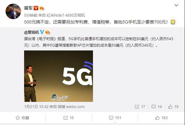 國產(chǎn)5G手機(jī)要比4G貴500元 雷軍:首批至少貴700 華為:呵呵