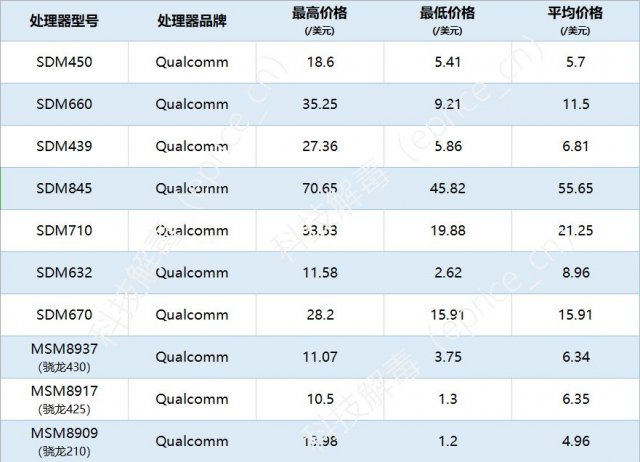從表格可以看出,高通驍龍845移動平臺最高價格高達70.65美元(約合人民幣480元),接近人民幣500元,是目前除了高通驍龍855之外定價最高的處理器。即便平均價格,高通驍龍845也高達55.65美元(約合人民幣379元)。