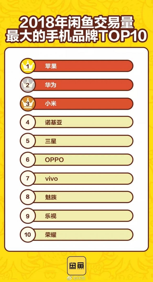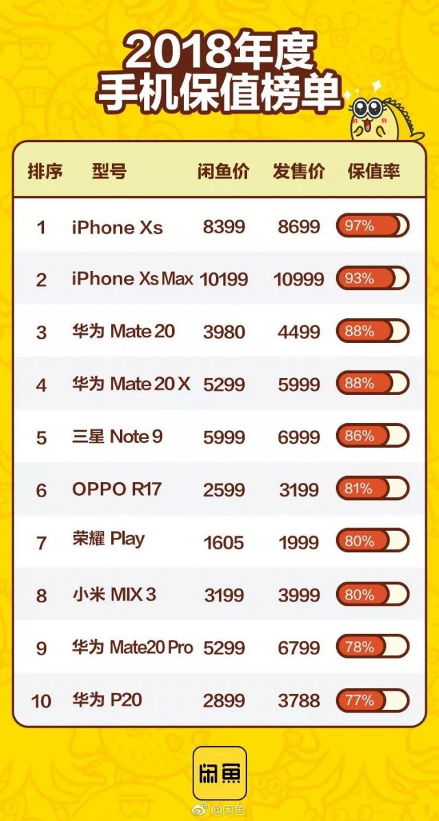 閑魚2018年手機(jī)保值率排行榜:iPhone最保值,華為Mate 20排名第三