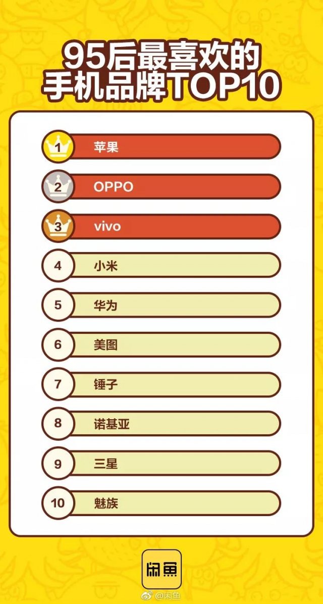 而在交易量方面, 蘋果、華為和小米分列前三名,令人驚訝的是諾基亞,排名第四名。閑魚的主力消費群體為 90 后, iPhone,vivo,OPPO 三大品牌最受 90 后歡迎。