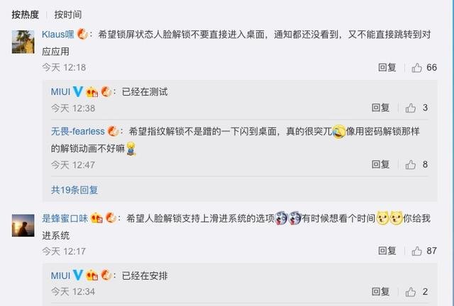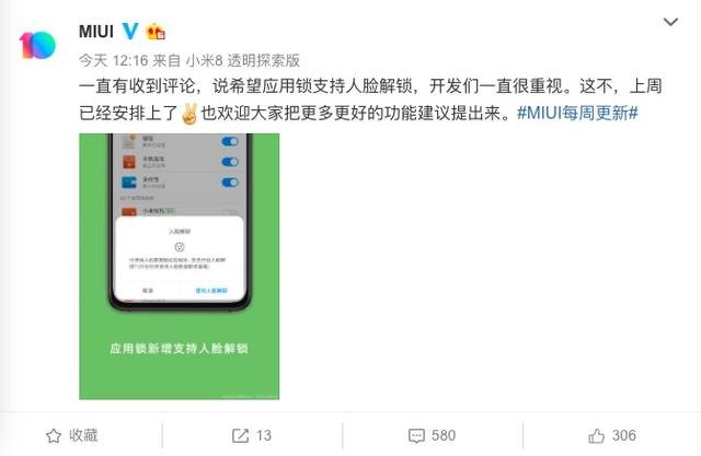 2月27日消息,MIUI官方微博稱:“一直有收到評論,說希望應用鎖支持人臉解鎖,開發們一直很重視。這不,上周已經安排上了。”