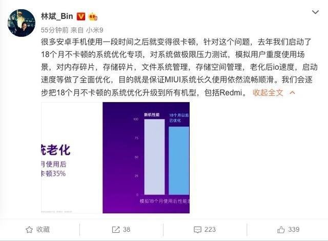 令人開心的是,這并不是小米9專屬福利,林斌強調,“會逐步把18個月不卡頓的系統優化升級到所有機型,包括Redmi。”
