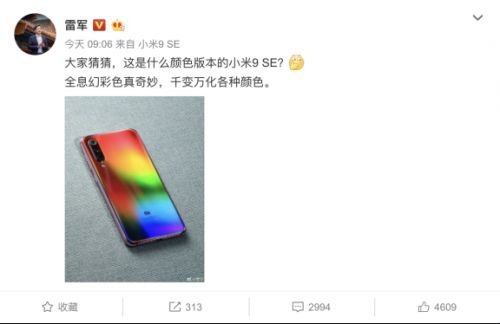 3月2日,小米總裁&創始人&CEO雷軍在微博放出了一臺小米9 SE的真機圖片,有所不同的是,這款小米9 SE采用了背板彩虹色的設計。手機在特定角度下會呈現出不同的色彩,紅橙黃綠青藍紫七種顏色由漸變效果統一,外觀非??犰?。