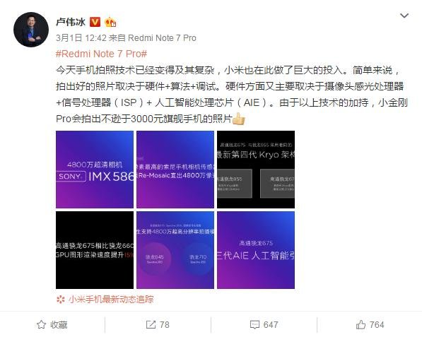 紅米Note 7 Pro相比紅米Note 7而言,最大的改變不外乎相機和處理器兩方面。首先是相機,紅米Note 7 Pro將原4800萬像素,采用三星GM 1傳感器更換為4800萬像素,采用索尼MIX 586傳感器。可以自出4800萬像素照片,不必靠合成達到4800萬像素。而盧偉冰在微博上稱"紅米Note 7 Pro拍照完全不遜于3000元旗艦手機,成像效果值得期待。"由此可以看出在相機方面有了顯著提升。