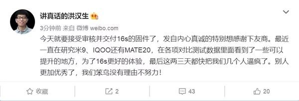 3月29日上午,魅族系統工程師洪漢生微博透露,今天就要接受審核并交付16s的固件了,發自內心真誠的特別想感謝下友商。