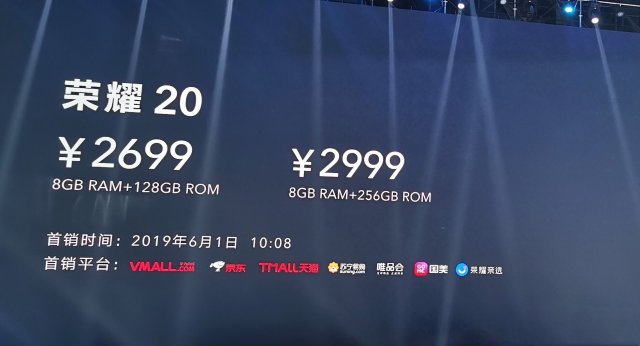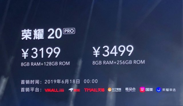 榮耀20 Pro 8GB+128GB售價3199元,8GB+256GB售價3499元。