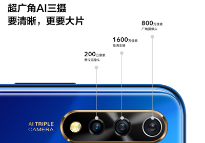 在相機方面,vivo Y7s后置AI三攝,分別為擁有1600萬像素的高清主攝像頭、擁有800萬像素的廣角攝像頭以及擁有200像素的景深攝像頭。其中主攝1600萬像素攝像頭采用索尼CMOS——IMX499。vivo Y7s同樣支持超級逆光拍照,動態(tài)范圍高達12.3EV。