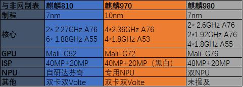 我們先來看看兩款處理器跟自家的旗艦處理器相比,麒麟810對比麒麟970/980的表格如下: