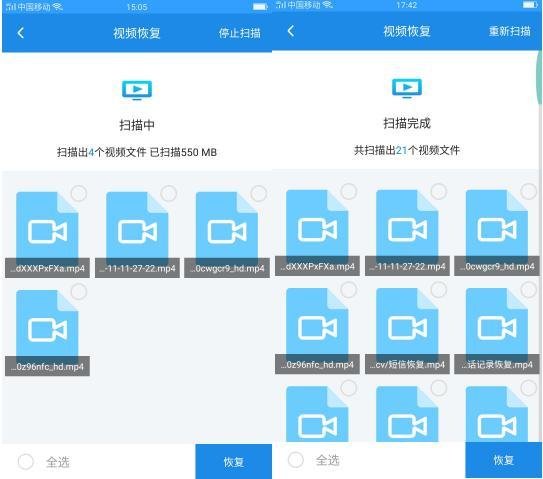 選擇之后,系統(tǒng)會進入自動掃描的頁面,等待片刻之后就可以看到被刪除的視頻、音頻信息了,選擇需要恢復的,確認恢復就可以啦。