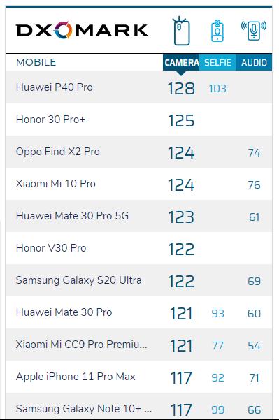 目前,在國外專業攝像評測機構DxOMark的手機拍照榜單中:華為P40 Pro憑借128的分數登頂榜首,榮耀30 Pro+、OPPO findX2 Pro、小米10 Pro緊隨其后,讓人吃驚的是第5名是去年發布的華為mate30 Pro 5G版本。