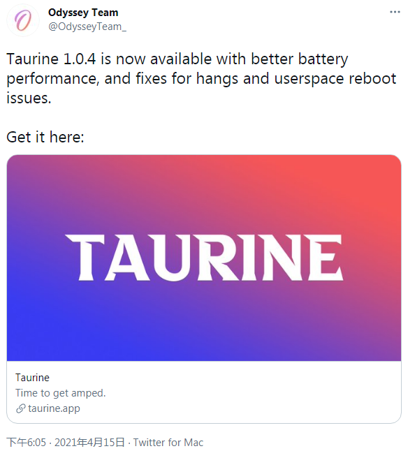 通常情況下,蘋果會在新版 iOS 發布后的一周后停用舊版簽名。但是對于想要越獄的用戶來說,目前尚無工具來破解 iOS 14.4.x 。Unc0ver 和 Taurine 的方案僅支持 iOS 14 ~ 14.3,但開發者仍在不斷更新以提升穩定性和性能表現。最新消息是,Odyssey 團隊發布了 Taurine 越獄的新改進。在版本號升至 1.0.4 的同時,還帶來了嚴重 Bug 的修復和電池續航改進。