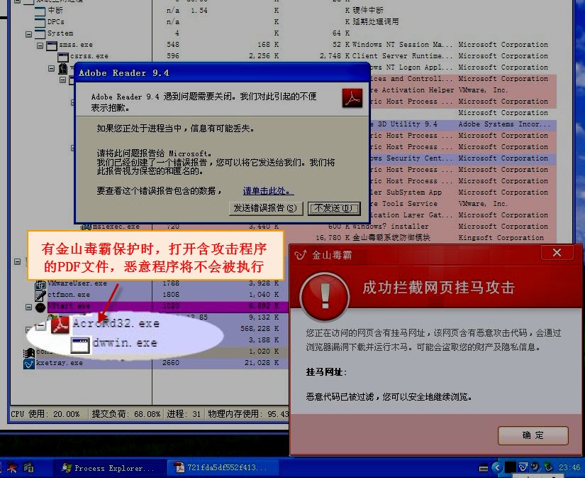金山毒霸安全專家指出,攻擊者會利用Adobe的最新漏洞制造特殊的PDF文件,或者用來網頁掛馬。當辦公一族打開或編輯這份特殊的PDF文檔時,惡意程序就會悄然運行,可導致計算機被遠程控制。攻擊者用在網頁掛馬上時,瀏覽器訪問一個特別的PDF文件,也會立刻中毒。