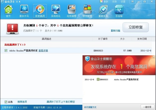 圖3 金山衛士提醒用戶安裝Adobe Reader安全補丁