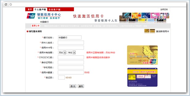 而針對(duì)“銀聯(lián)信用卡”的釣魚詐騙網(wǎng)站則以“快速激活”的幌子套取用戶的重要個(gè)人信息(如下圖)。