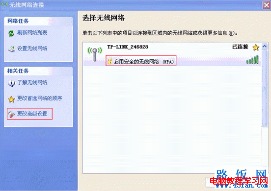 3)點(diǎn)擊更改高級(jí)設(shè)置,進(jìn)入無線網(wǎng)絡(luò)連接屬性,并在首選網(wǎng)絡(luò)中刪除不相關(guān)的無線網(wǎng)絡(luò)配置。