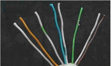 2、剝除外包皮即可見到雙絞線的 4 對 8 條芯線,并且可以看到每對的顏色都不同。先把 4 對芯線一字并排排列,然后再把每對芯線分開,并按從左到右:白橙、橙、 白綠、藍、白藍、綠、白棕、棕的順序排列(這種排列稱為 568B 排序)。然后 用網線鉗垂直于芯線排列方向剪齊。