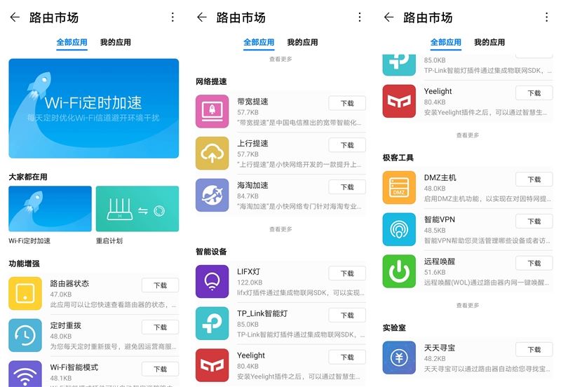除了這些功能外,華為路由Q2S還擁有一個(gè)路由市場,里面提供了數(shù)量極多的各種擴(kuò)展插件。讓華為路由Q2S的可玩性、擴(kuò)展性進(jìn)一步提升。