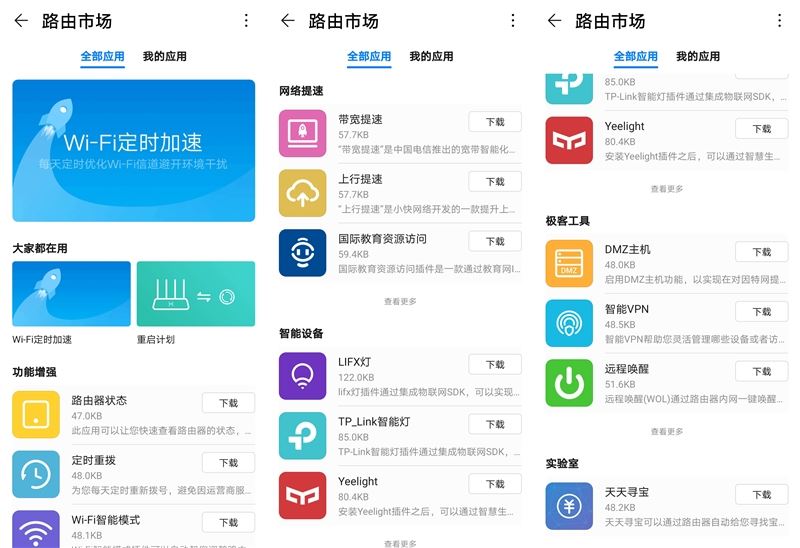 配置連接則非常簡(jiǎn)單,只用輸入一次管理員密碼和Wi-Fi密碼,就會(huì)自動(dòng)完成配置流程。無(wú)論是網(wǎng)頁(yè)管理界面還是手機(jī)APP端的管理界面,功能設(shè)置都十分齊全。尤其是手機(jī)端還提供了一個(gè)路由市場(chǎng),里面提供了定時(shí)重?fù)堋⒅悄躒PN等功能插件。