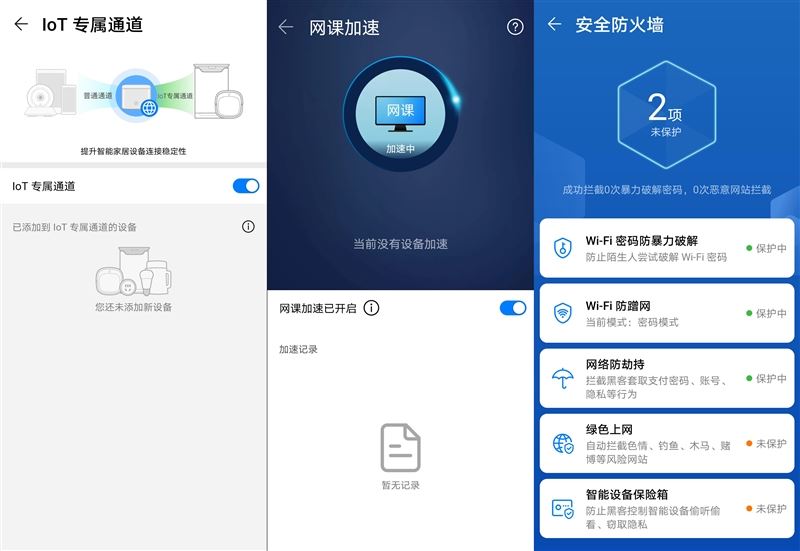除了兒童上網(wǎng)保護(hù)外,這樣方便的功能在智慧生活A(yù)PP中還有不少。比如IoT專用通道,可以改善家中智能家居與路由器的連接、網(wǎng)課加速,十分貼合當(dāng)下家庭的需要等等。