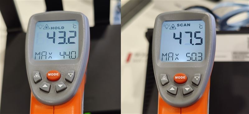 溫度方面,華為路由AX3 Pro路由器需要需要注意配合良好的通風(fēng)散熱,正面僅Hi-Link按鍵附近微微發(fā)熱,整體與室溫一致。底面溫度則高一些,并且由于墊腳較低,所以發(fā)熱面積較大。