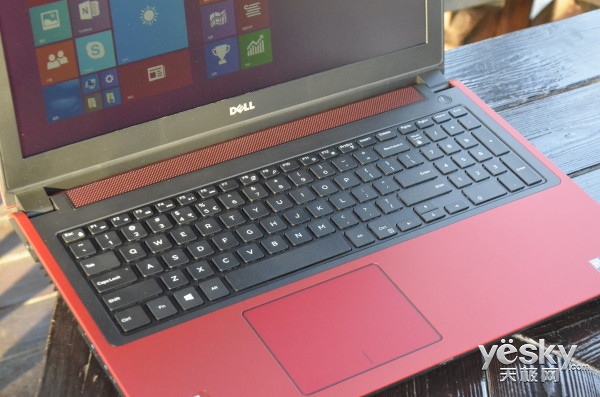 在戴爾游匣7000的鍵盤板面,醒目的黑紅撞色非常炫酷,而且在紅色部分戴爾還通過深淺的調整從而將掌托、觸控板、音響都區分了出來。在掌托部分還采用了和A面相同的類膚質涂層,使得彈性與手感俱佳,再加上經典的巧克力式鍵盤也讓游匣7000的B面更加出彩。
