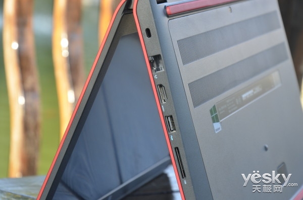 在戴爾游匣7000的右側面,由上至下依次分布著一個電腦鎖、一個網線接口、一個HDMI接口、一個USB 3.0接口以及一處SD卡槽。