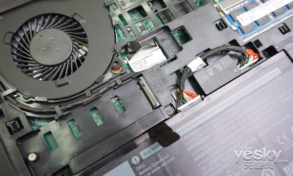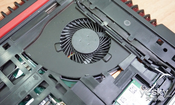 戴爾游匣7000游戲本的散熱整體設(shè)計(jì)都集中在了上半部分,風(fēng)扇位于筆記本的上部?jī)山翘?,讓散熱鋼管進(jìn)行交叉形成很好的覆蓋。