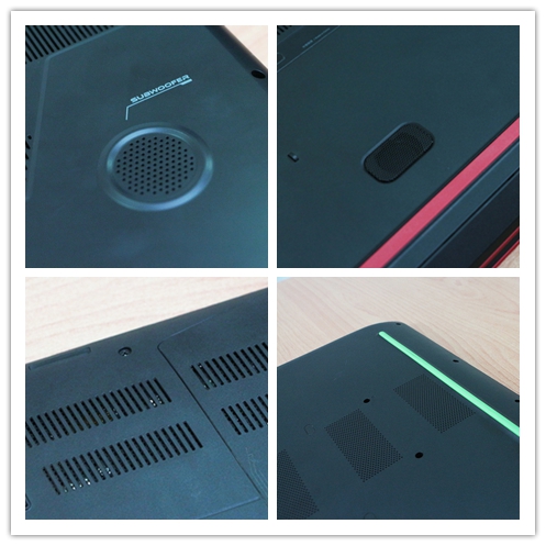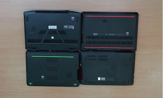 通過上面的俯瞰照,大家可以發現這四款游戲本在入風孔、整機腳墊、螺絲位置等方面的差異是非常大的:只有雷神911和游匣7000在D面加入了低音炮;只有游匣7000和暗夜精靈采用了條形腳墊的設計;入風孔方面,由多到少依次為:游匣7000、雷神911、暗夜精靈、飛行堡壘。