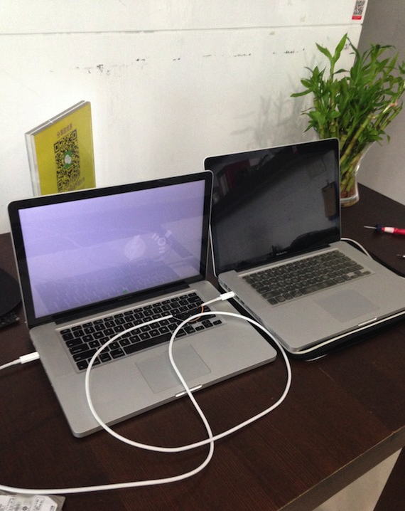 5、然后裝好蓋好后蓋就好了,把兩臺裝好硬盤的電腦的其中一臺裝好系統(tǒng)和常用軟件。用雷電線把兩臺電腦接在一起。