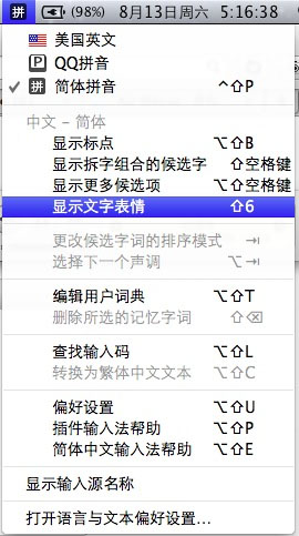 如果你實(shí)在記不住這個(gè)快捷鍵,可以點(diǎn)擊 Mac 屏幕頂部菜單欄的輸入法圖標(biāo),在下拉菜單里選擇“顯示文字表情”。比快捷鍵慢多了,還好一般人應(yīng)該不怎么經(jīng)常輸入顏文字表情。否則還是記住 shift+6 吧。