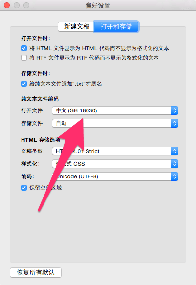 解決方法很簡(jiǎn)單:打開(kāi)「文本編輯.app」,點(diǎn)擊屏幕左上角菜單欄的「文本編輯」>「偏好設(shè)置…」>「打開(kāi)和存儲(chǔ)」。選擇打開(kāi)純文本文件的編碼為「中文 GBxxxx」即可。