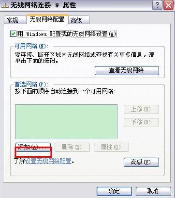 這時候點擊“更改高級設置”后出現無線網絡連接 屬性 對話框,在這里我們手動建立一個無線網絡以便我們連接到DIR-605上。如下圖所示,點擊“添加”。