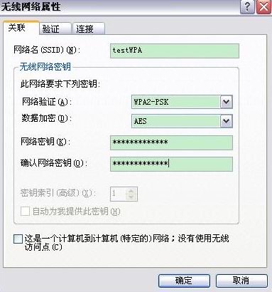 (2)無線網絡密鑰:網絡驗證選擇WPA2-PSK;數據加密選擇AES;然后再填寫在路由器上設置好的無線網絡密鑰并予以確認。