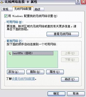 上述內容填寫完畢確定后,就可以發現在無線網絡連接 屬性------首選網絡 中看到我們剛才建立的一個可用網絡testWPA。