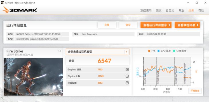 性能方面我們使用 3DMark FireStrike 進(jìn)行測試,其最終圖形分?jǐn)?shù)為 7333,達(dá)到了 1050Ti 應(yīng)有的水平,性能足以滿足大部分常見的網(wǎng)游和部分大型單機(jī)游戲。