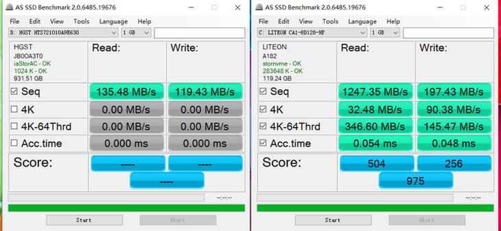 光影精靈 4 代綠刃采用了常見的雙硬盤組合方式,同時滿足了用戶對運行速度和存儲容量的需求。SSD 部分配備了來自 LITEON 的 128GB PCIe 固態(tài)硬盤,在 AS SSD 軟件的測試中,其最終讀取速度為 1247.35MB/S,寫入速度為 197.43MB/S。