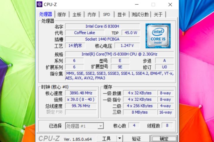 我們拿到的機(jī)器配備了 i5-8300HQ 處理器,其基于 Intel Coffee Lake 架構(gòu)設(shè)計,14nm 制造工藝,四核心八線程,主頻 2.3GHz,睿頻 4.0GHz,TDP 為 45W。熟悉 Intel 平臺的同學(xué)一定會發(fā)現(xiàn)這顆 CPU 與 Intel 上一代產(chǎn)品 i7-7700HQ 的規(guī)格非常相似,二者的差別只有核心頻率(i5-8300HQ 比 i7-7700HQ 高 0.2GHz)以及核芯顯卡的頻率(i5-8300HQ 比 i7-7700HQ 低 0.1GHz)。