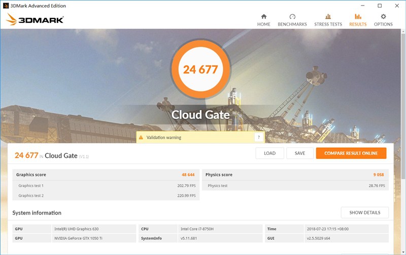 GTX1050 Ti顯卡的3DMark CloudGate跑分。