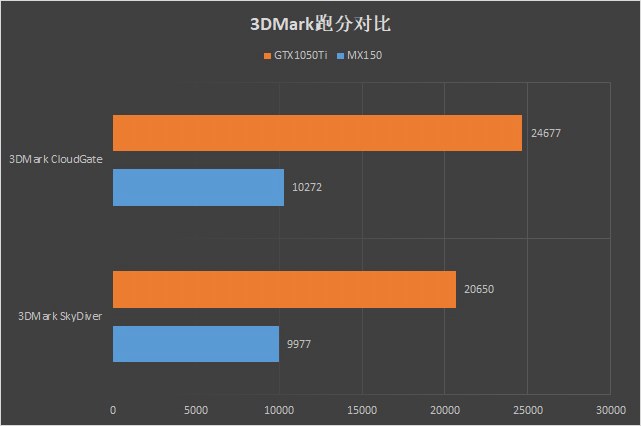 3DMark跑分對比,可以看到在3DMark SkyDiver測試中,對比輕薄本常用顯卡MX150,GTX1050 Ti跑分超出106%!而在SkyDriver測試中超過了140%!達到了近乎3倍的性能跑分。