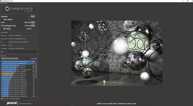 在CINEBENCH R15中,這顆i7-8750H處理器跑出了單核166,多核1106的分數,中規中矩。