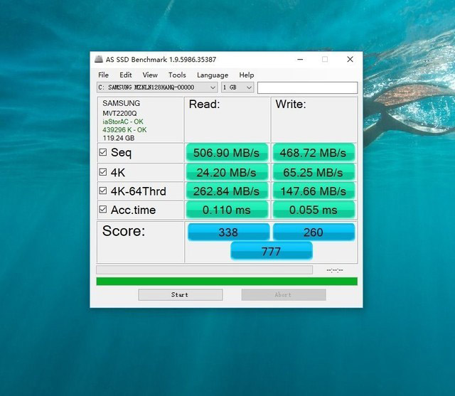 GP63使用的是一塊三星固態硬盤,我們用AS SSD對其進行測試,隨機讀取速度為506MB/s、寫入468MB/s,速度一般,整體得分為777分。(又在暗示?)