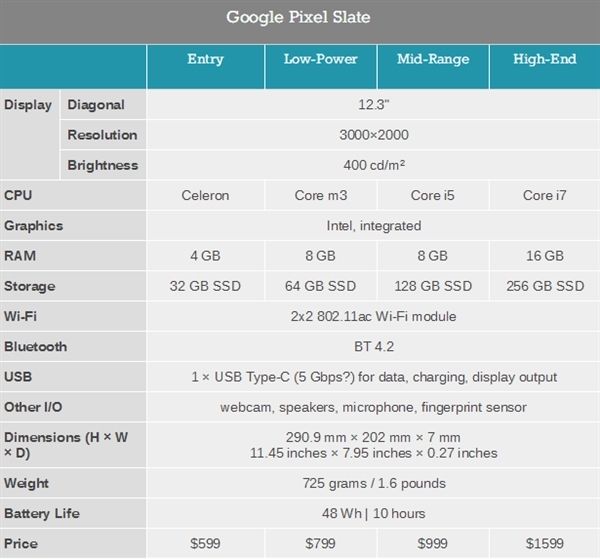 Pxiel Slate提供四種配置級別, 賽揚/4GB/32GB 599美元(¥4150)、m3/8GB/64GB 799美元(¥5530)、i5/8GB/128GB 999美元(¥6910)、i7/8GB/256GB 1599美元(¥11070) ,第一批今年底在美國、加拿大、英國等地上市。