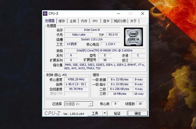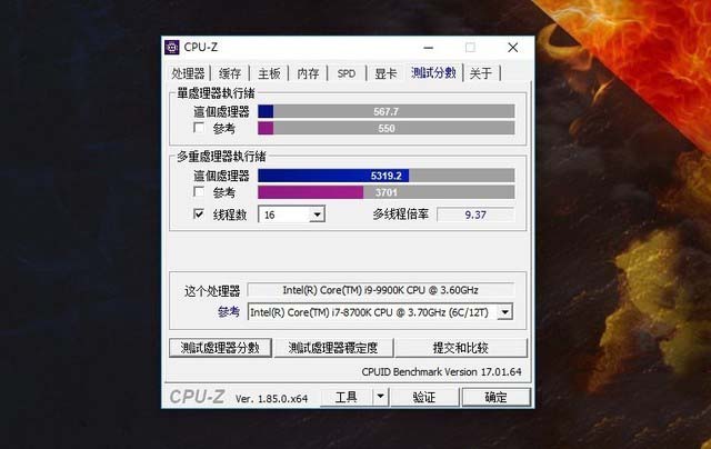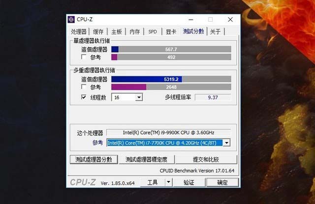 先看CPU-Z性能測(cè)試情況,通過測(cè)試可以看到酷睿i9 9900K單核評(píng)分567.7分,多核評(píng)分5319.2分,相對(duì)于酷睿i7 7700K來說性能提升超過2倍,相對(duì)于上一代酷睿i7 8700K來說性能也有較大幅度提升。